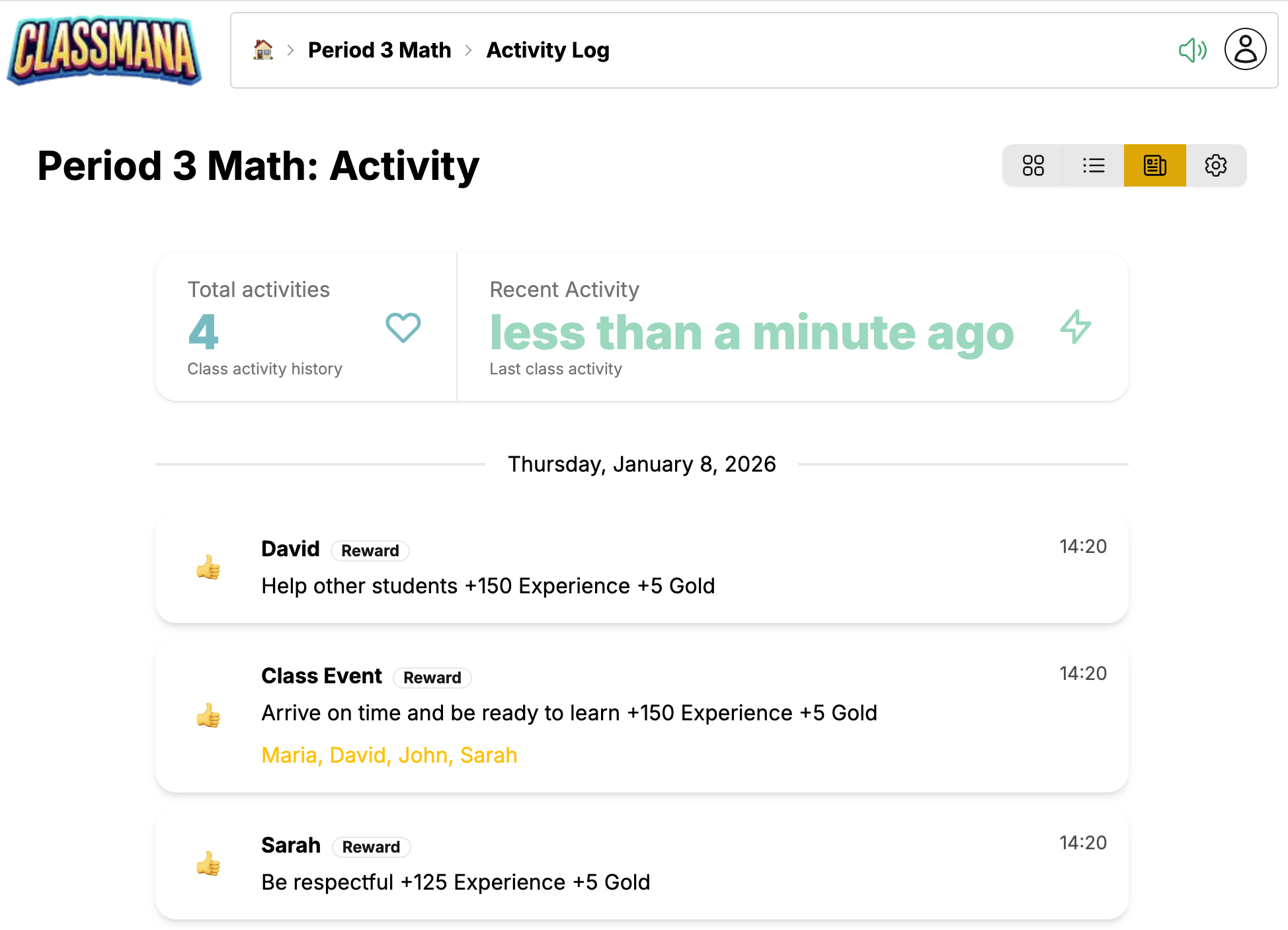 Dashboard Kelas adalah pusat kendali Anda untuk mengelola kelas. Dari sini Anda dapat melihat siswa, memberikan hadiah, menggunakan kekuatan, melacak aktivitas, dan mengonfigurasi pengaturan kelas.