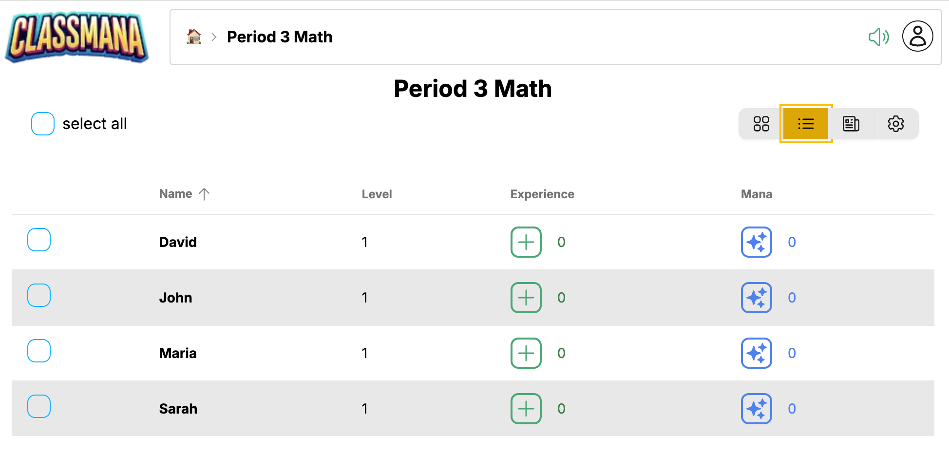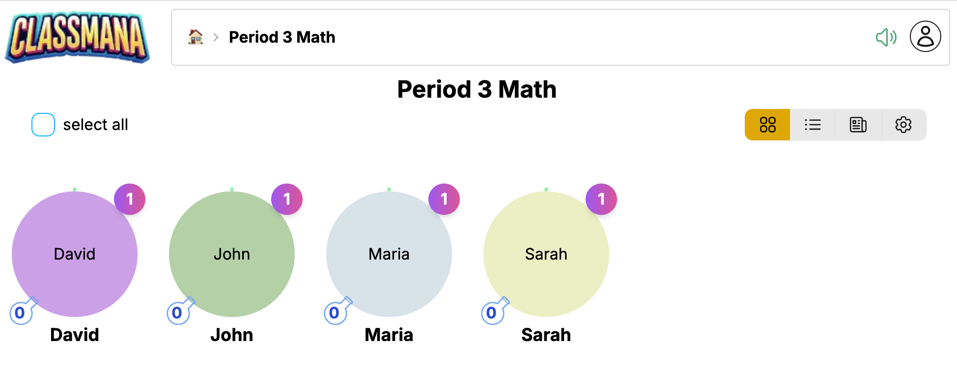 Tabel Siswa menyediakan tampilan kompak seperti spreadsheet dari kelas Anda.