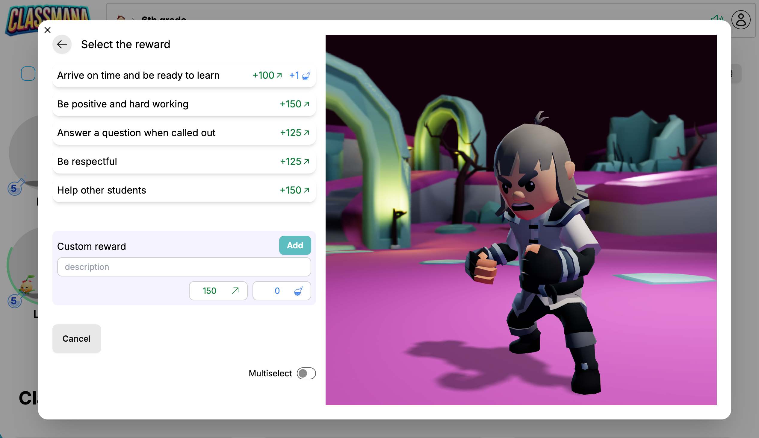 Panel hadiah bekerja dengan cara yang sama - klik hadiah yang telah dikonfigurasi sebelumnya atau buat hadiah kustom. Hadiah akan diterapkan kepada semua siswa yang dipilih.