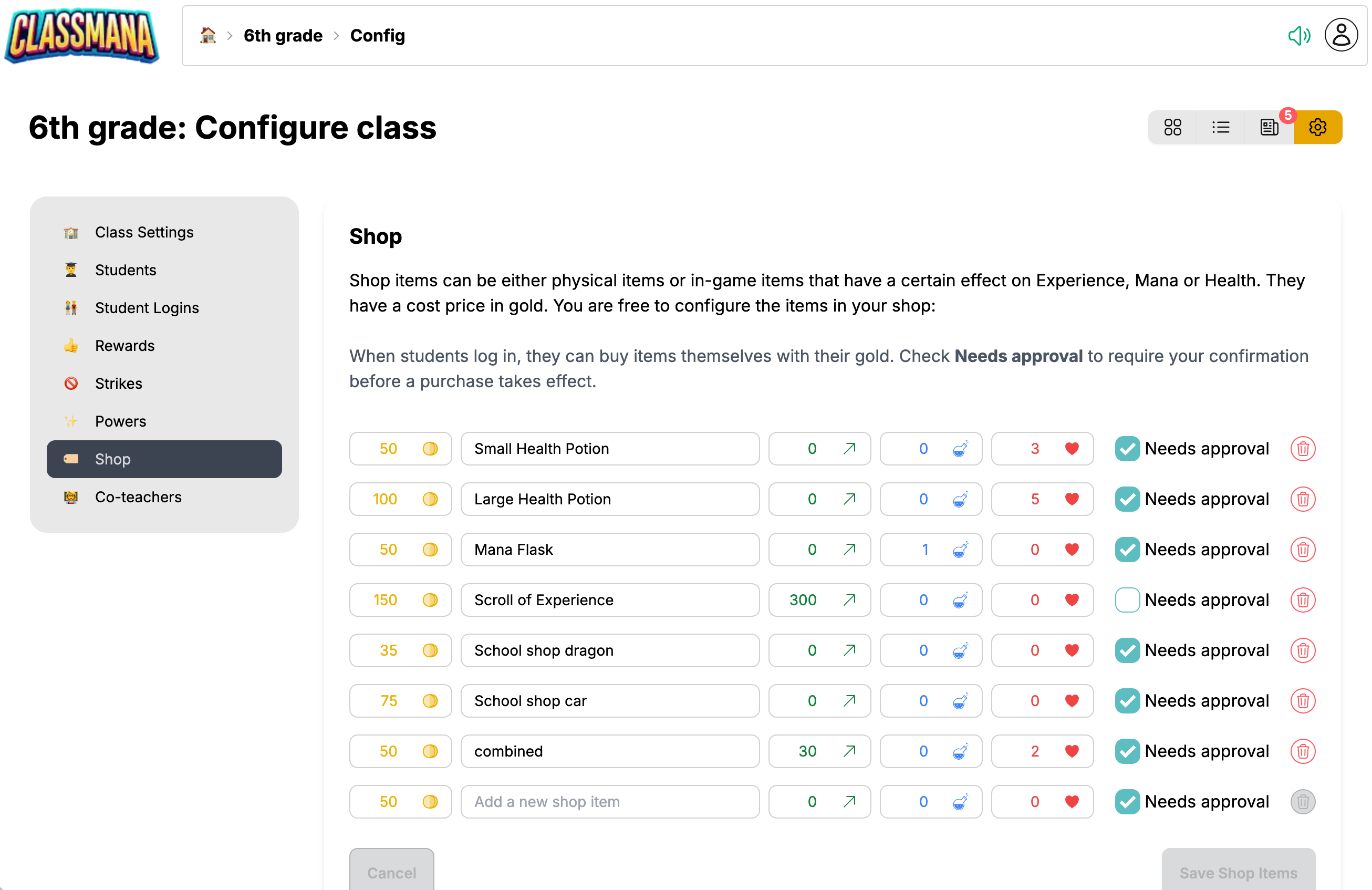 - Daftar Item Toko - Semua item toko yang dikonfigurasi untuk kelas Anda